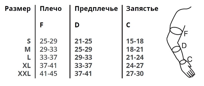 - необходимо измерить окружность на уровне запястья (C), окружность самой широкой части предплечья перед локтем (D), окружность плеча на 3 см ниже подмышечной впадины (F);