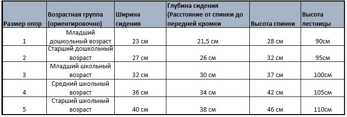 Опора для сидения и стояния подбирается по росту ребенка. Чтобы подобрать необходимый размер используйте следующие величины и соотнесите Ваши замеры с таблицей: