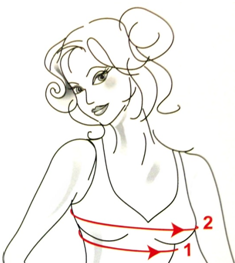 - Обхват под грудью. При этом сантиметровая лента располагается параллельно полу. (Например, обхват под грудью равен 85 см.)